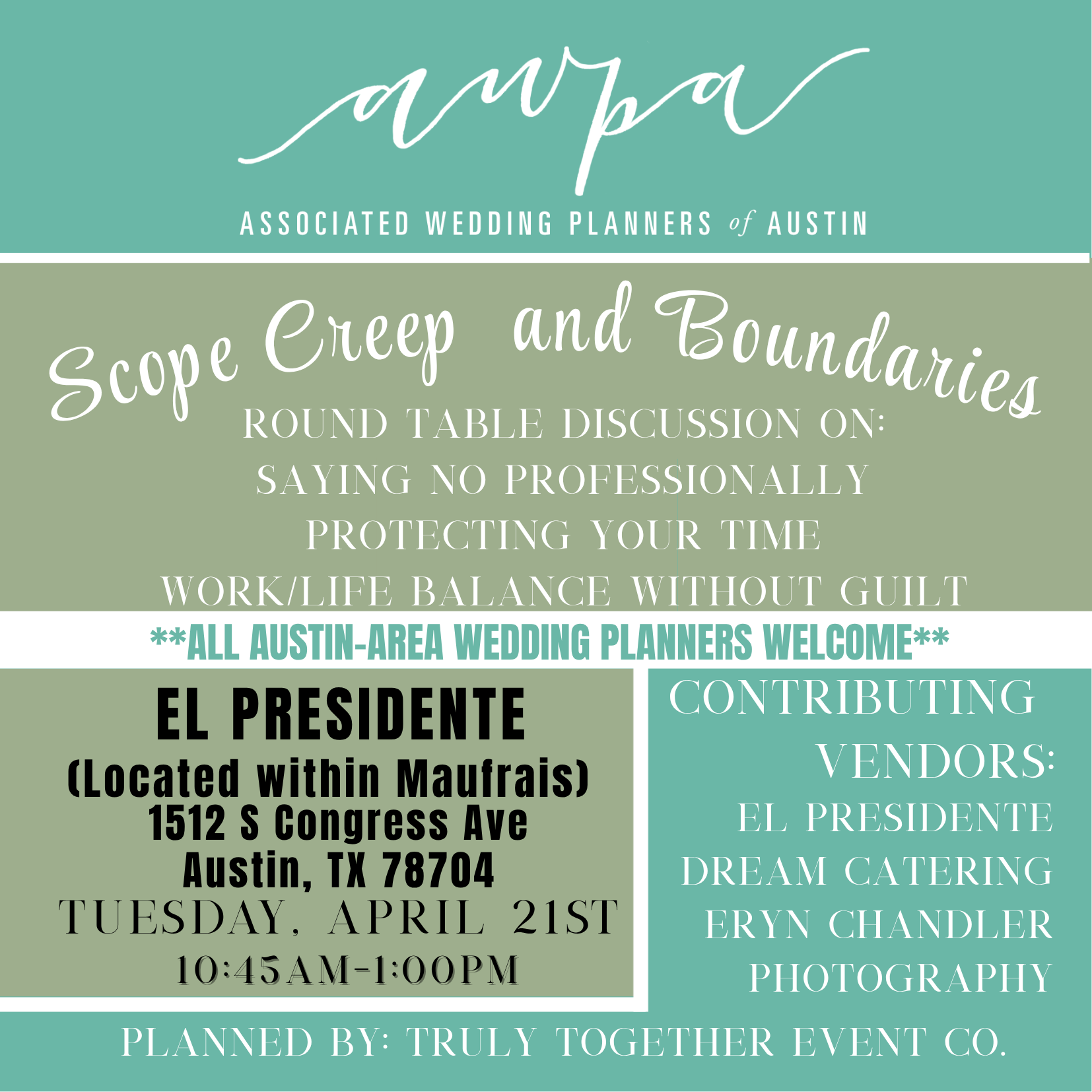 All Austin-area planners are welcome to come join in the discussion on manageable ways to handle scope creep within weddings and how we as planners can set reasonable boundaries with clients and industry partners. Let’s dive into this honest talk on topics such as: